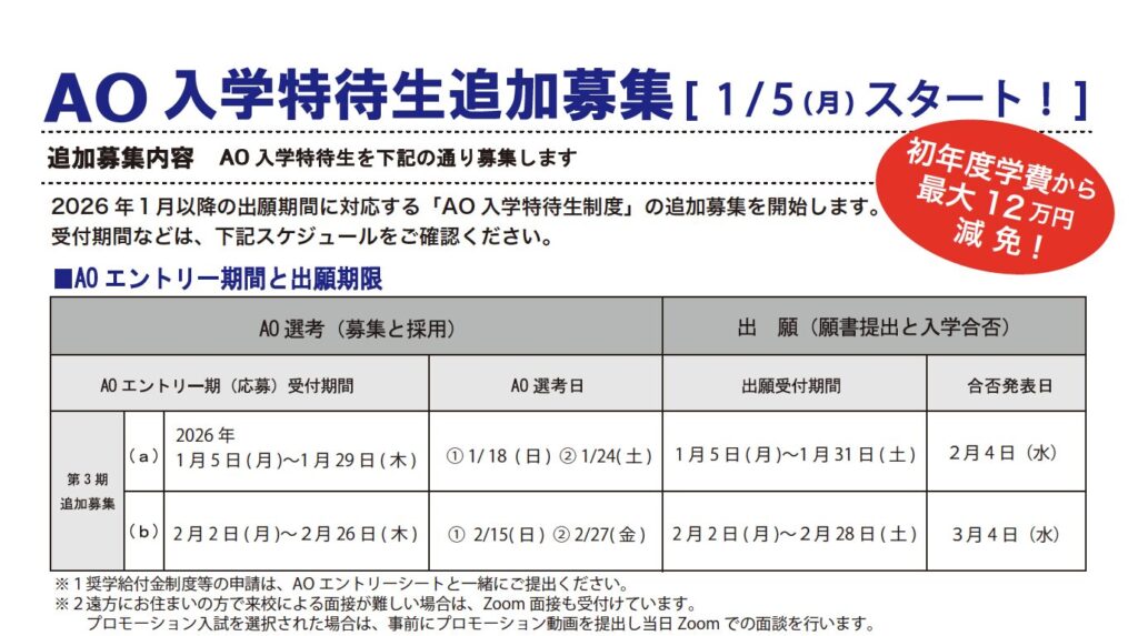 現状の合格者人数を踏まえ、AO入学特待生追加募集を行うこととなりました。是非、現在検討中の方もこれから検討しようと思っておられる方もお得な入試方法の追加募集をお見逃しなく!