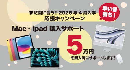本校入学が決定して、入学後Macもしくはipadを購入される方は、本校から5万円の購入サポートが!